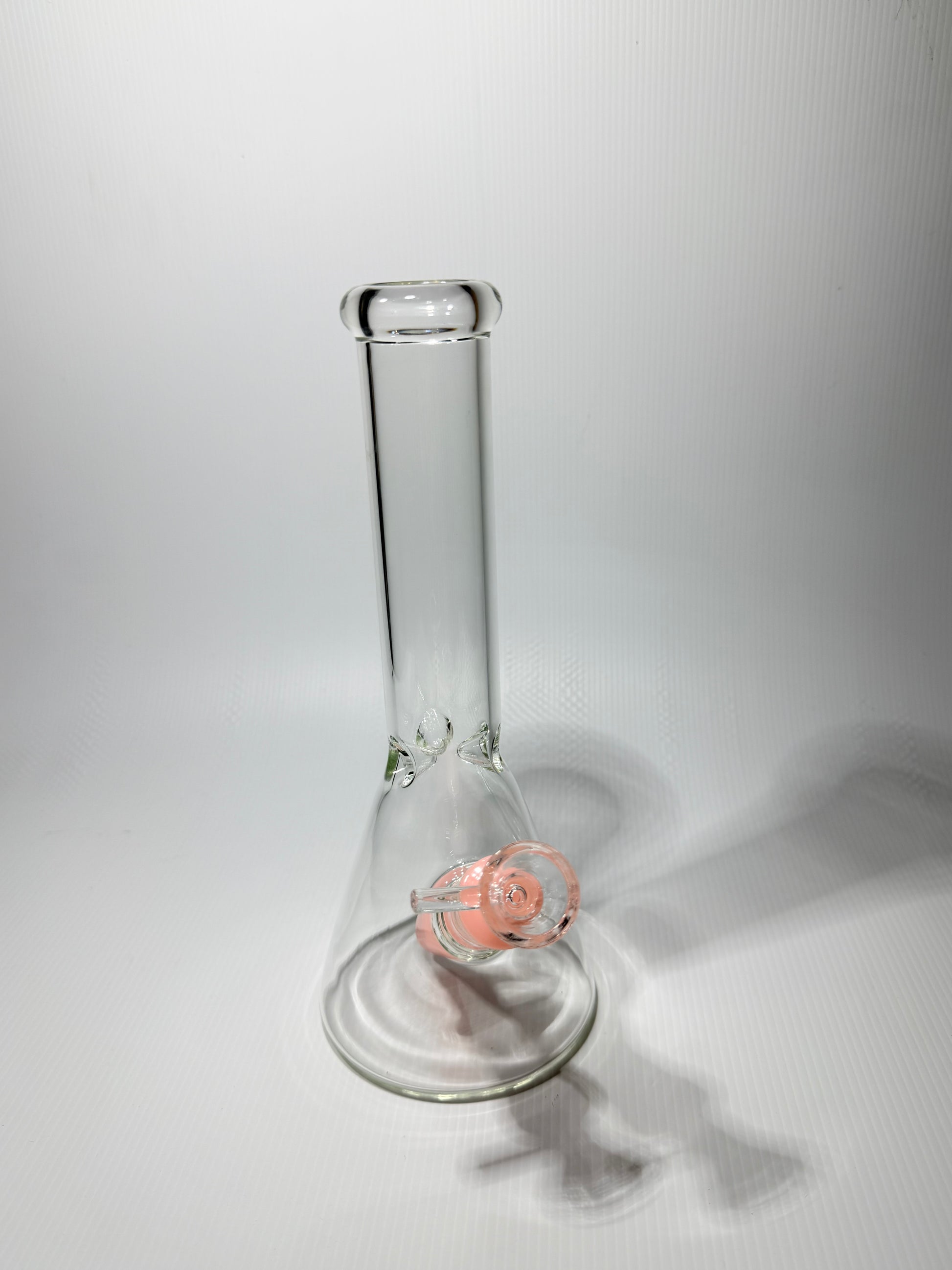 A classic beaker-style bong with a straight neck and flared mouthpiece for comfortable pulls. Made from thick borosilicate glass and paired with pink-tinted accessories for a clean, minimal look.