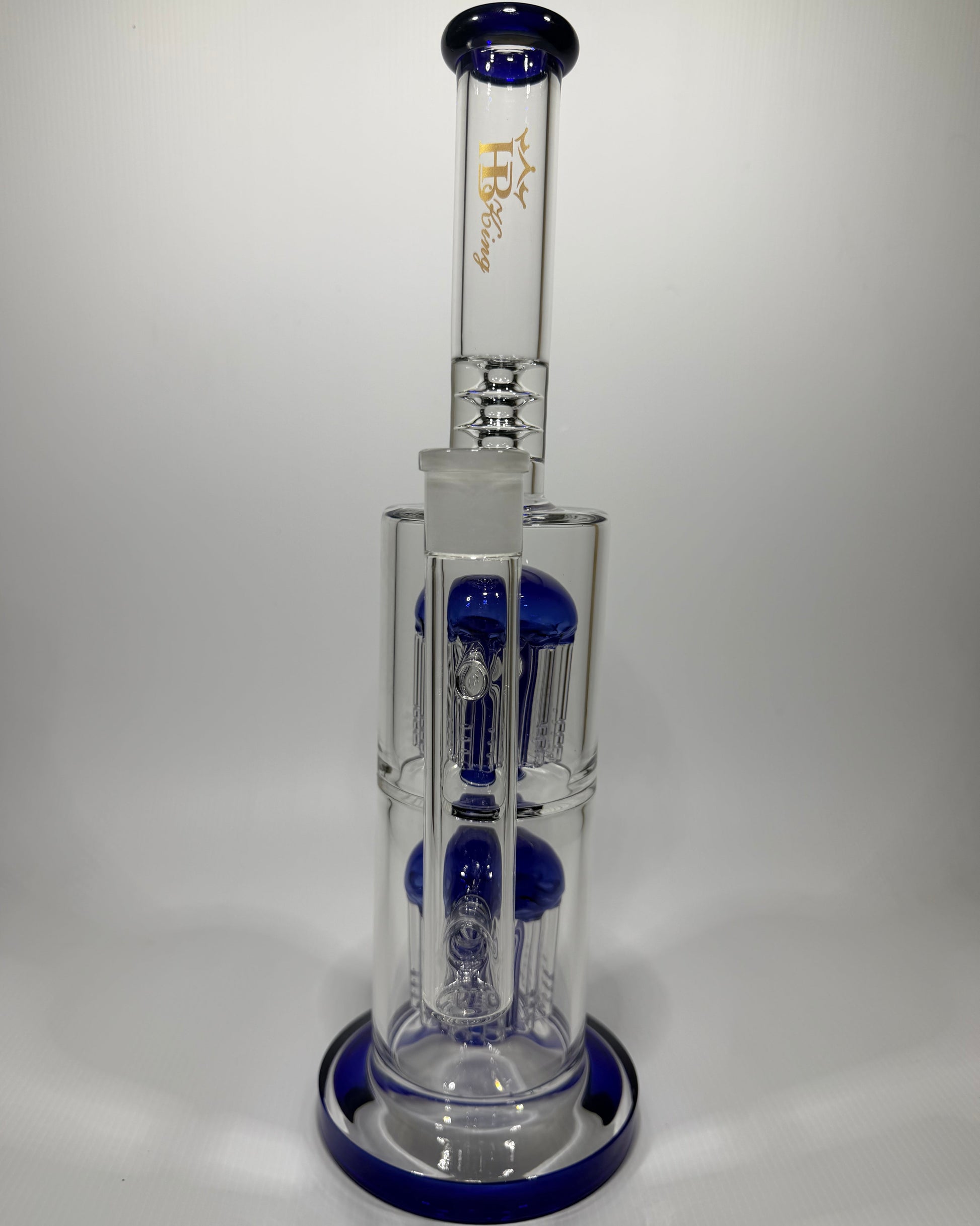 A tall straight-tube bong featuring stacked blue dome percolators for smooth, well-filtered hits. Built from thick borosilicate glass with a wide base for added stability and clean blue accents throughout.