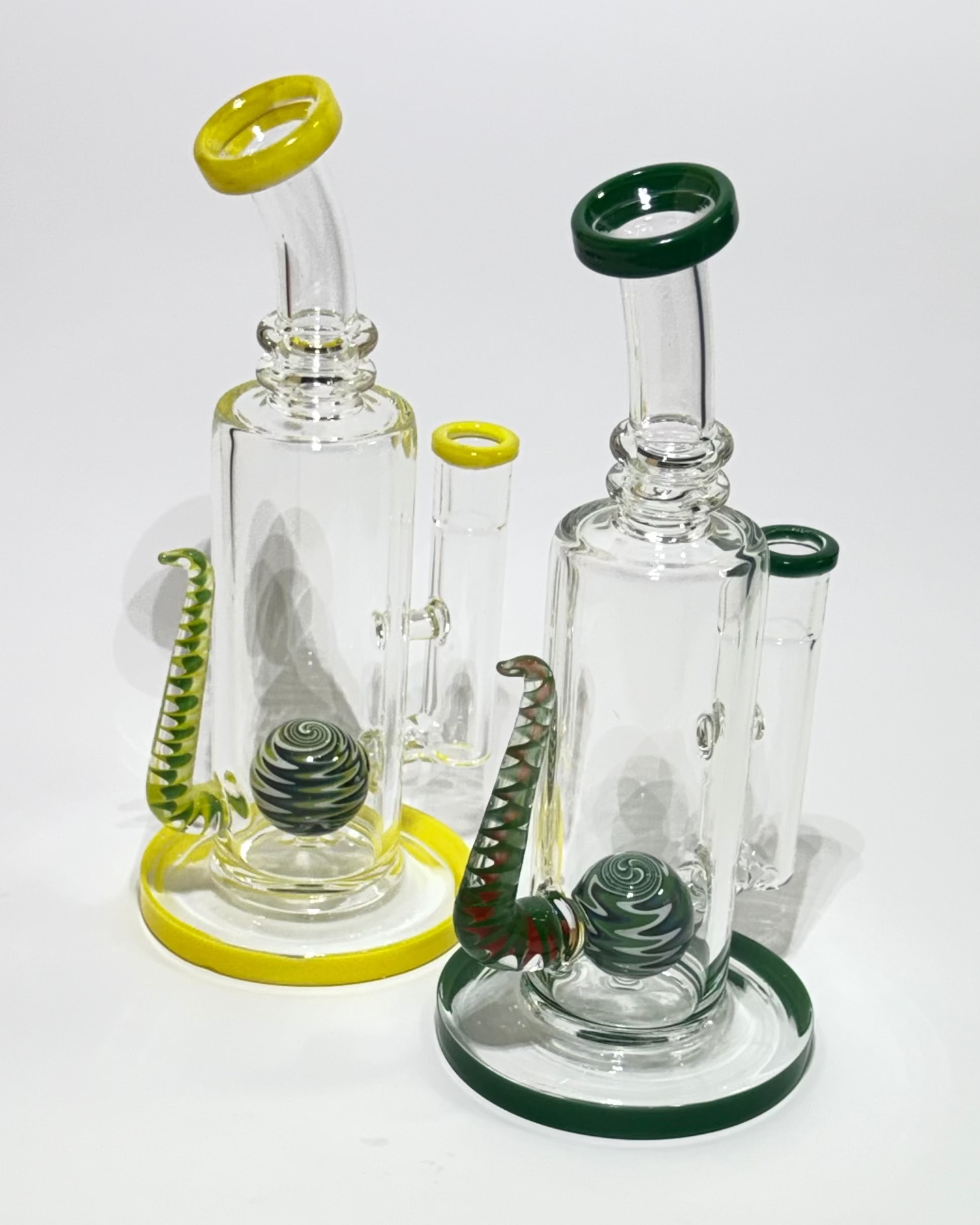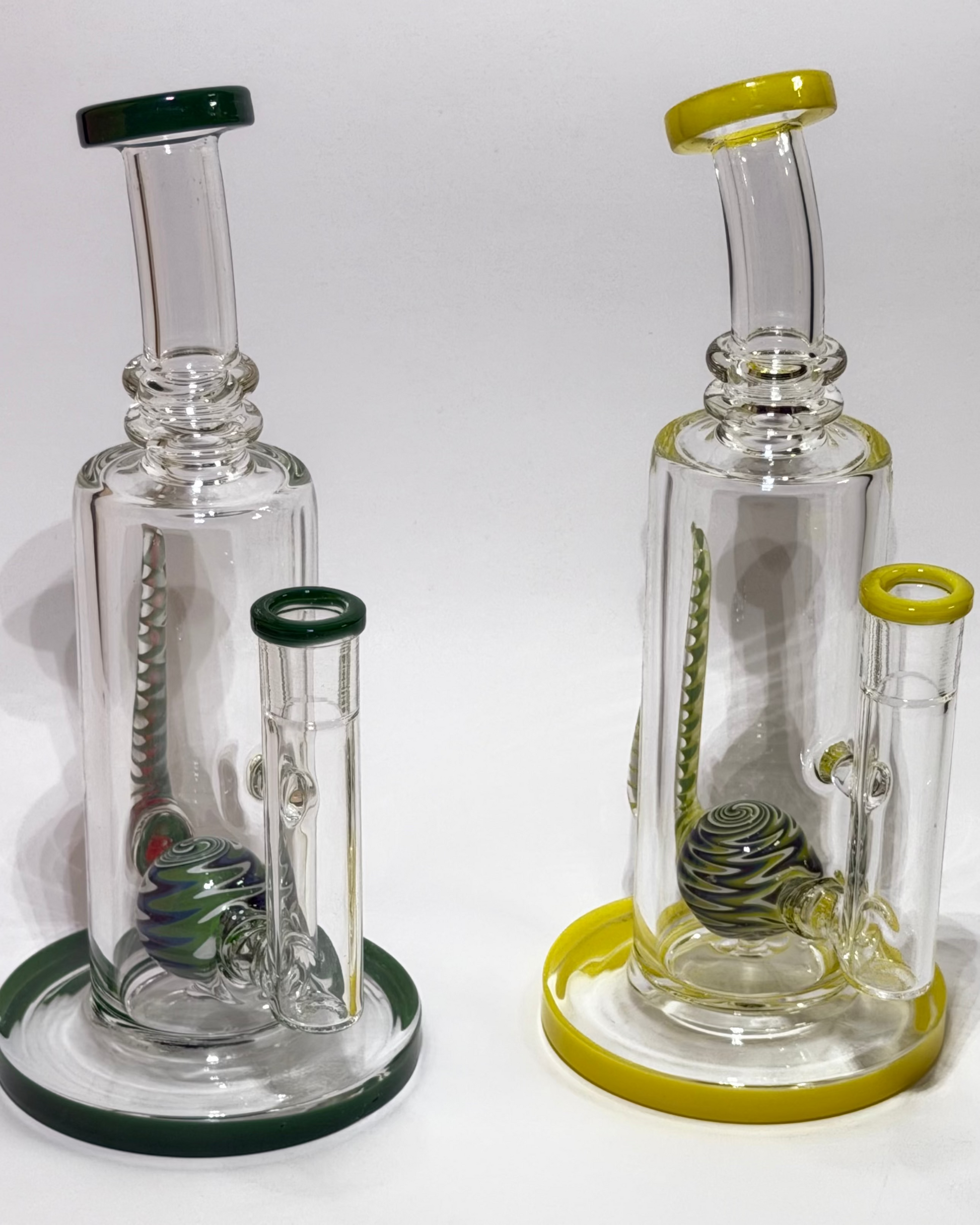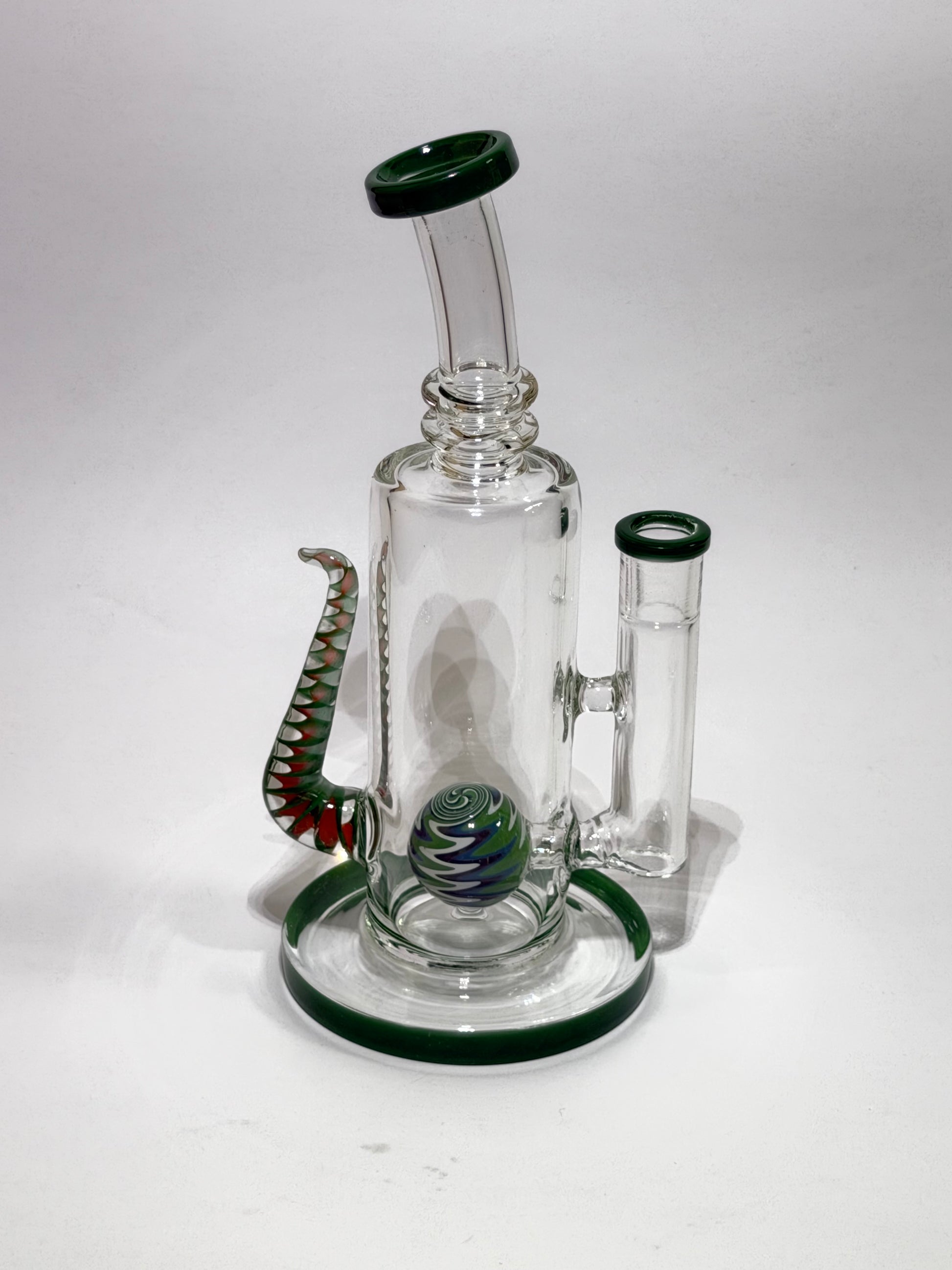 A sculptural rig with curved lines, spiral grip, and a swirling internal marble perc. This piece blends ergonomic design with artistic flair, built for smooth hits and standout shelf appeal.