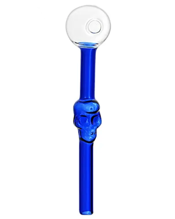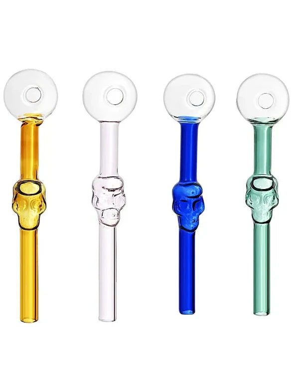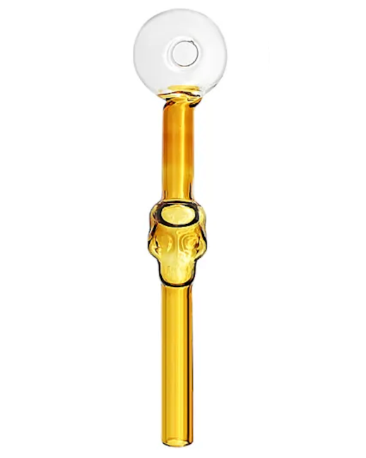 Clear glass vaporising pipe with a bulbous chamber and straight coloured stem with Skull design. Available in multiple color options including black, gold, green, blue, and amber.