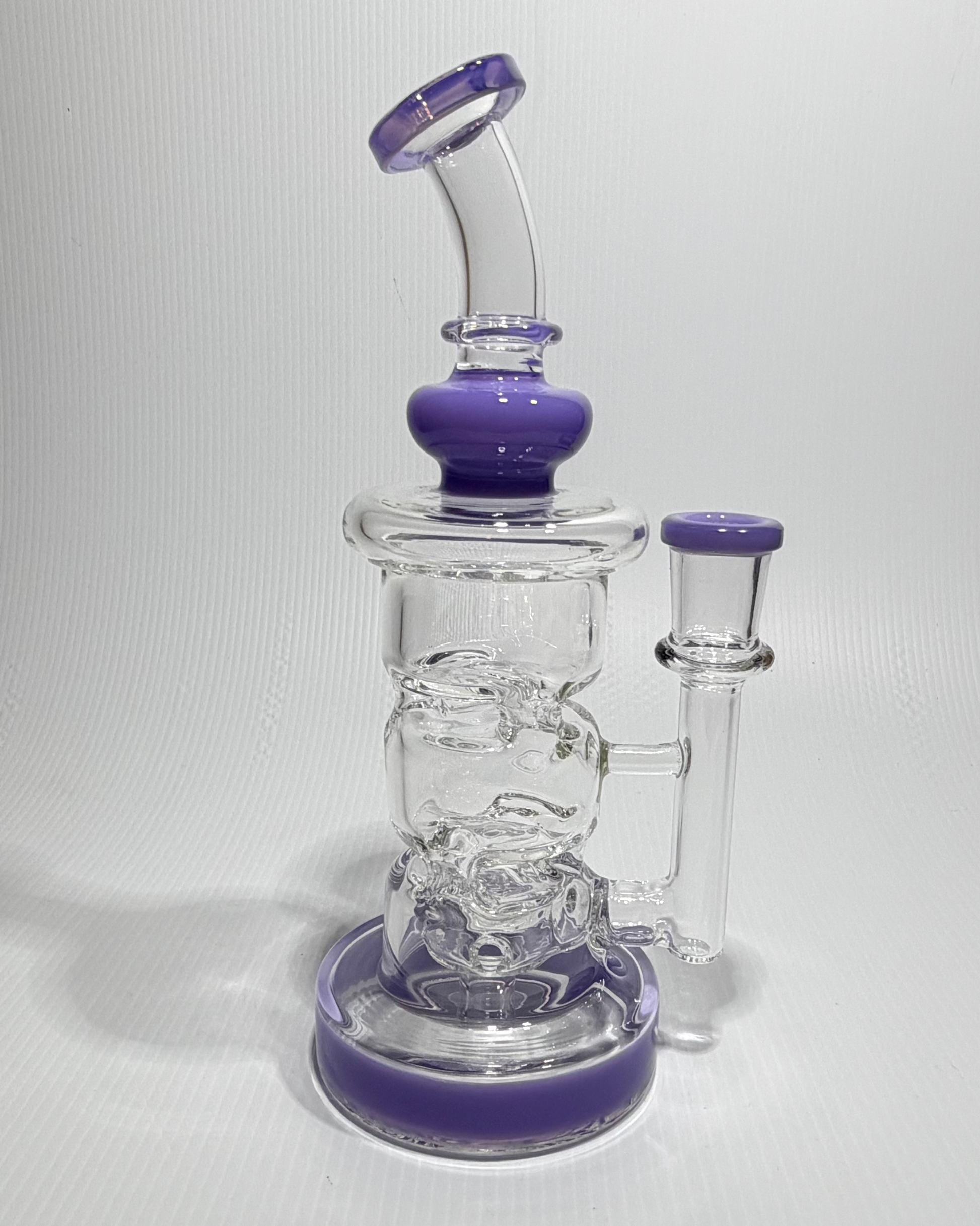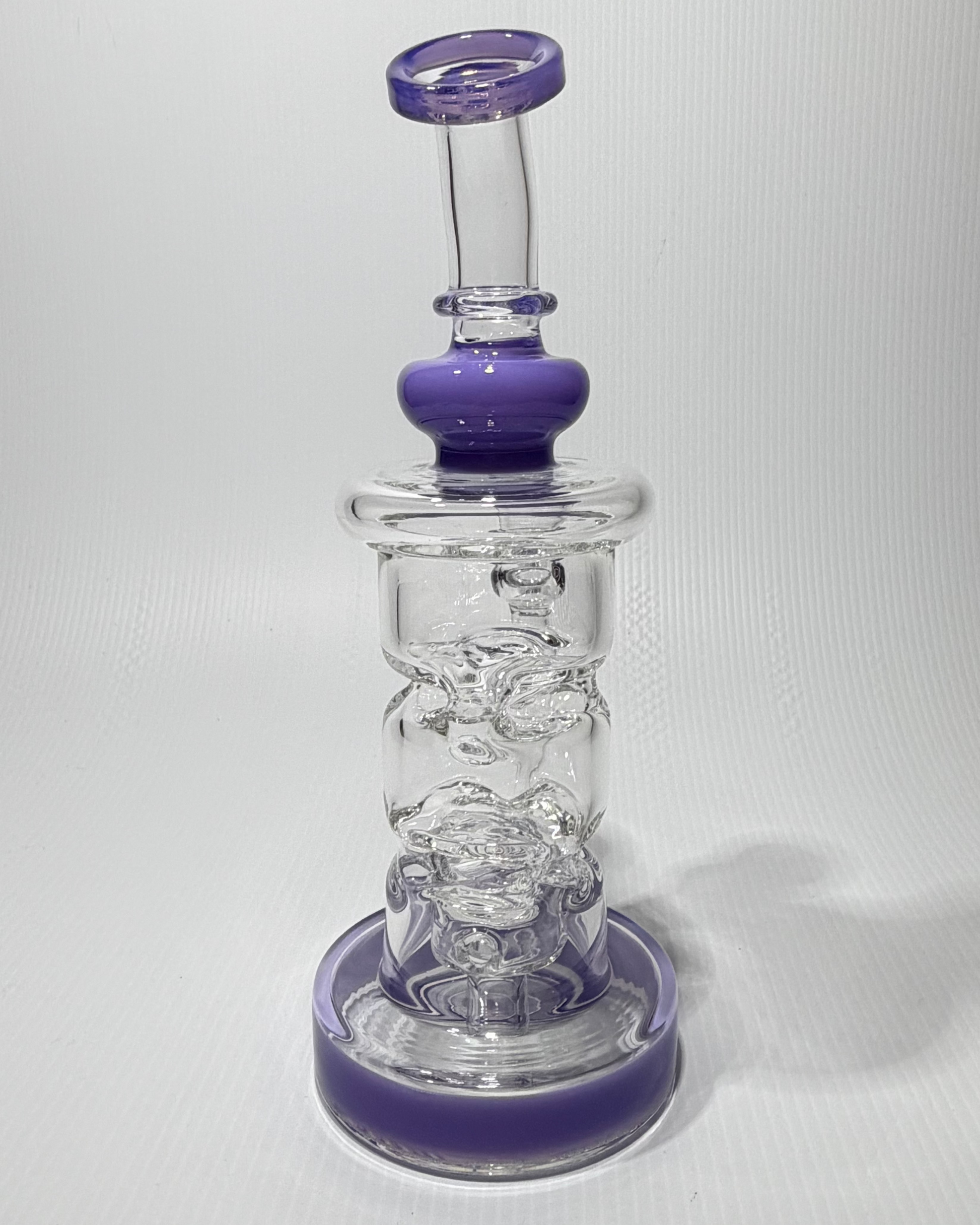 This clear glass rig features a wide base and curved neck for smooth handling and splash-free hits. With stacked chambers and clean airflow, it’s built for comfort and performance.